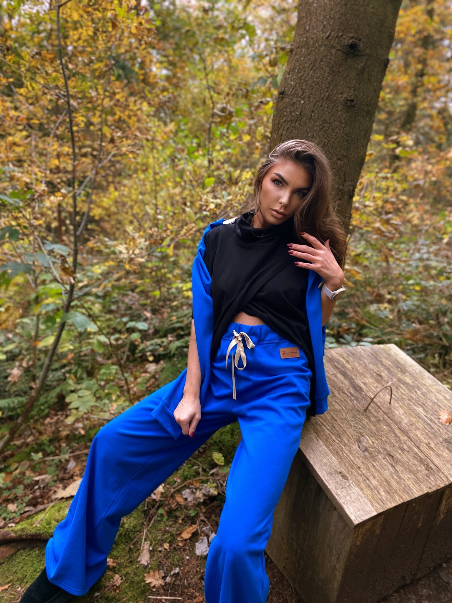 Wrap yourself in comfort and style with our cotton tracksuit set in a deep cobalt shade. Perfect for autumn walks in nature, cozy evenings at home, or chic city outings. Made from premium-quality cotton, it ensures all-day comfort. The wide-leg trousers and oversized sweatshirt add a modern touch, while subtle details like the natural drawstring and logo patch emphasize its uniqueness. Choose a style that blends simplicity with nature!