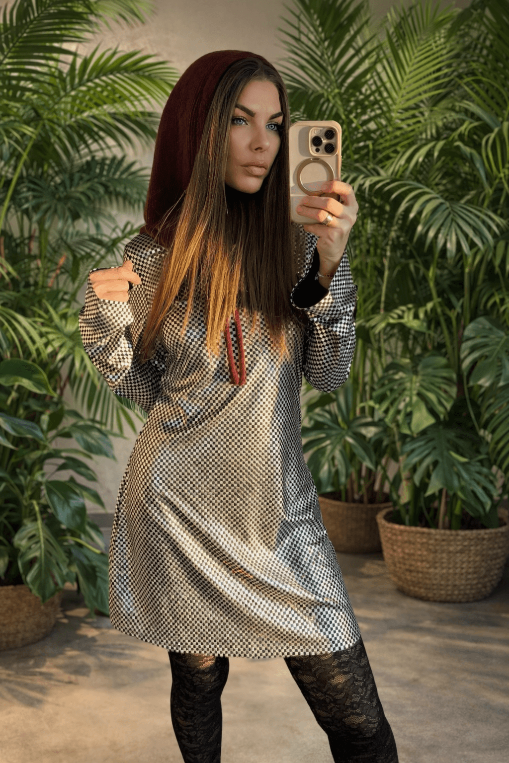 Silver and black shimmering dress is designed for women looking for an elegant outfit for evening wear, carnival celebrations or special occasions. The subtle silver-black check pattern gently reflects light, creating a refined yet understated look.