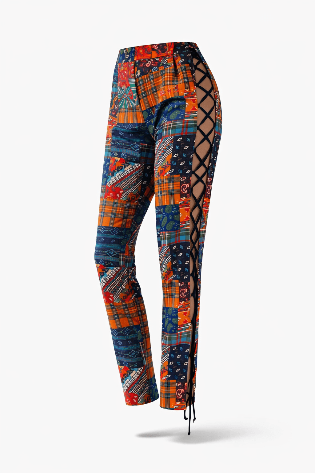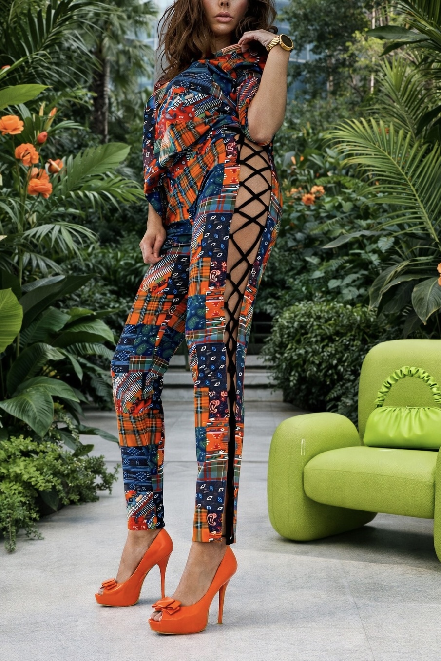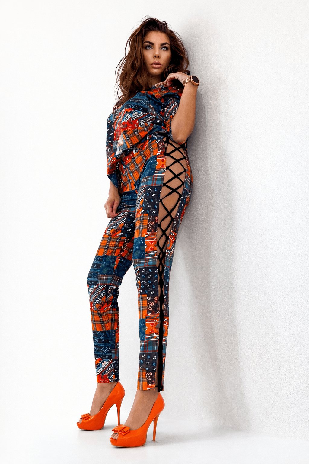 The pants feature side lacing, sculpting the body like an artist’s vision, while the loose tunic flows between daring confidence and subtle sensuality.